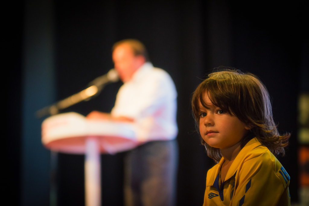 Barnkonventionen ska bli svensk lag. Det säger Stefan Löfven som syns i bakgrunden på bilden. Han är Sveriges statsminister. Foto: Klas-Herman Lundgren