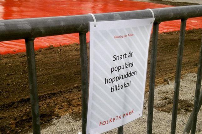 Hoppkudden öppnar inom en vecka. Nu är den på en annan plats i parken. Det är större avstånd till grannarna.