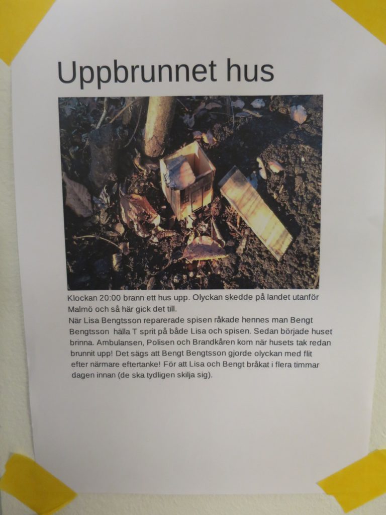 När man är en reporter är det viktigt att få svar på olika sorters frågor. Tim och Matilda fick svar på frågorna: När brann huset upp? Var fanns huset? Vem bodde huset? Hur gick det till när huset brann upp? Varför hände det?
