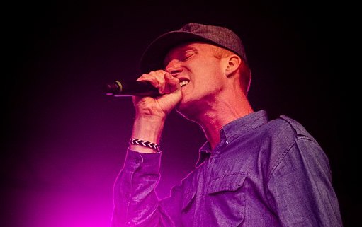 Artisten står på scen och sjunger i en mick.
