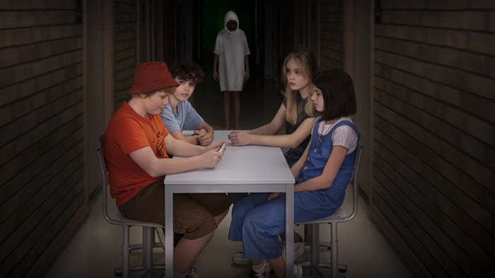 Theodor Westrin (Mårten), Noah Johansson Khadraoui (Alex), Julie Erlandsson (Irma) och Ayumi Miyaki Höglund (Maya) utgör huvudrollskvartetten i "12:13". Här med den mystiska telefonen. Bild: SVT
