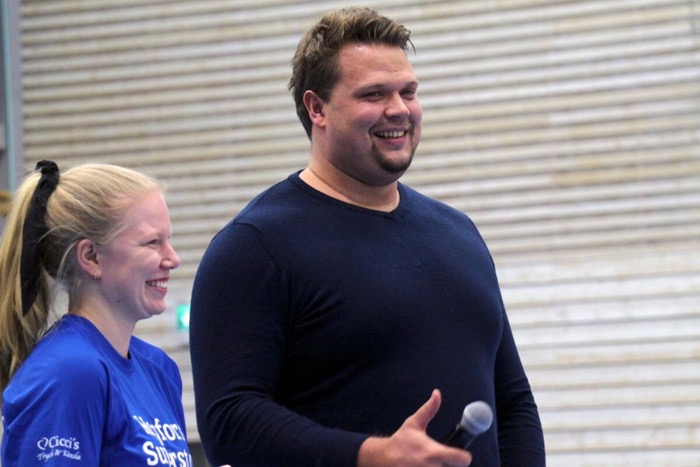 Daniel Ståhl svarade på frågor med ett leende. Lite hjälp hade han av arrangören och funktionären Elin Nilsson. Foto: Peder Kaldal