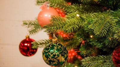 En julgran med röda och guldfärgade dekorationer